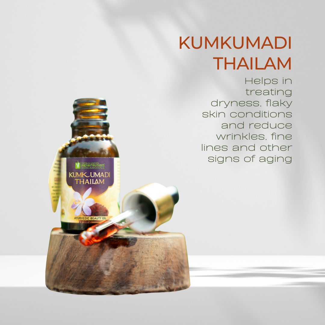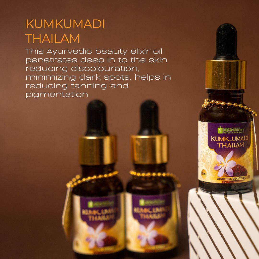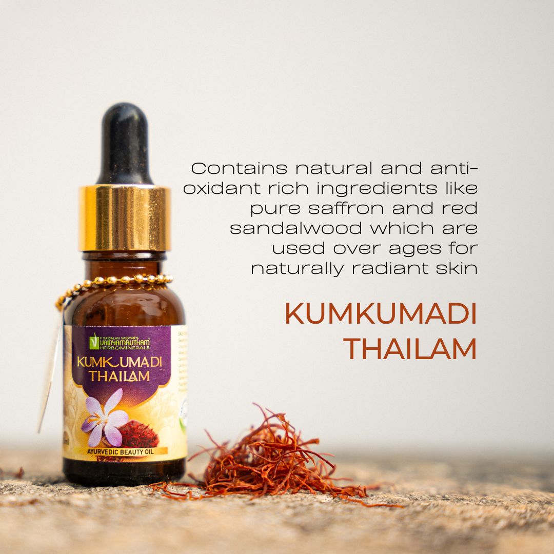 Elevate your skincare routine with Vaidyamrutham Ayurvedic Kumkumadi Thailam, a luxurious face oil crafted in Kerala using time-honored Ayurvedic principles. Infused with pure saffron and red sandalwood, this elixir is rich in antioxidants and natural nutrients that have been trusted for centuries to deliver naturally radiant skin.