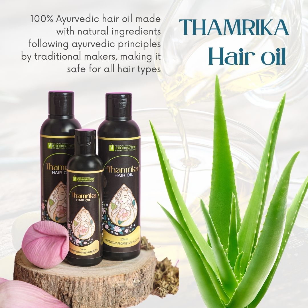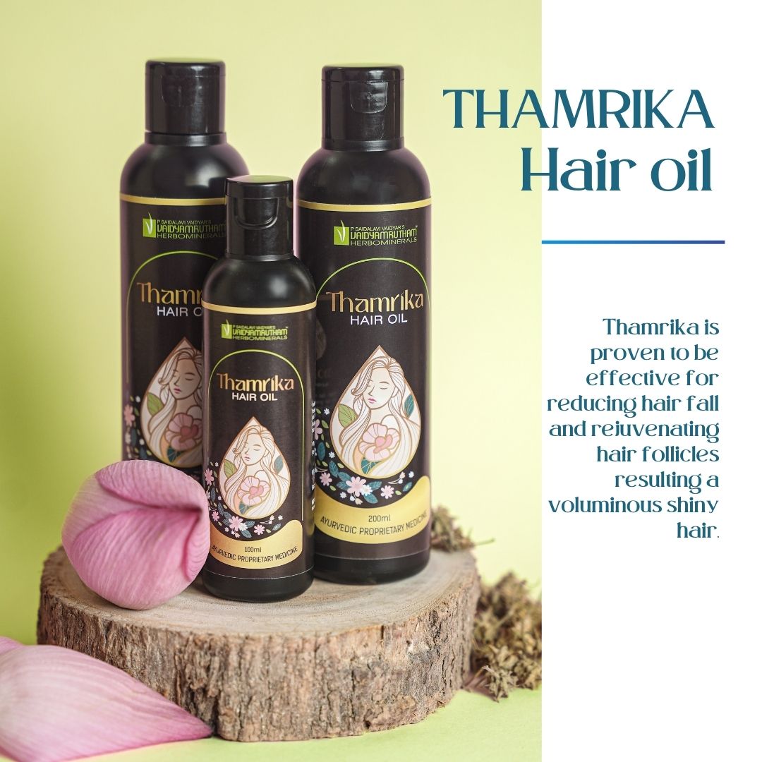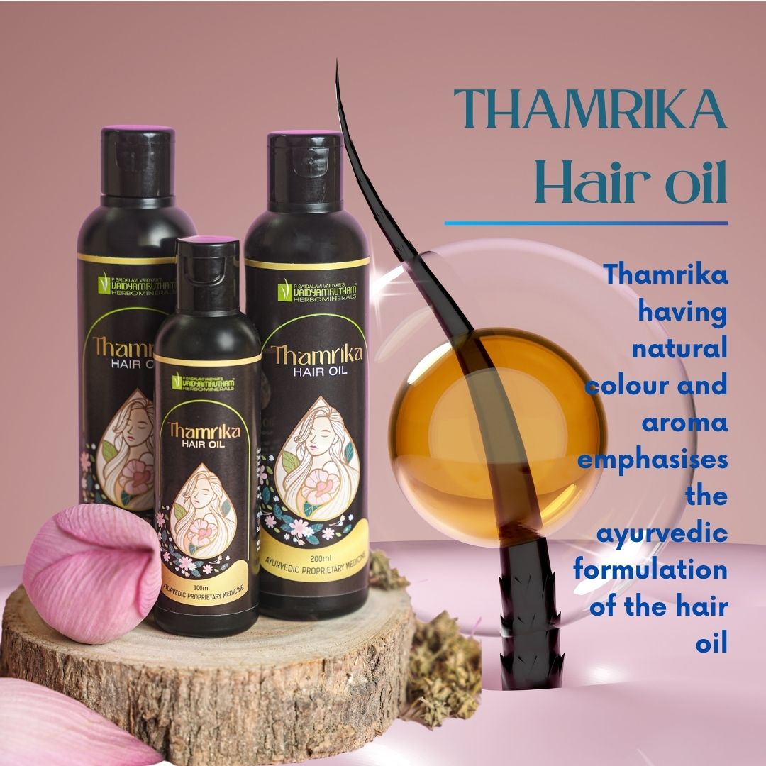 Experience the essence of Ayurveda with Vaidyamrutham Thamrika Ayurvedic Hair Growth Oil, a 100% natural and chemical-free formula crafted with powerful herbs and oils like Bringaraja, Indigofera Tinctoria, Brahmi, Aloe Vera, Amla, and Coconut Oil. This unique blend nourishes your hair from root to tip, strengthens hair follicles, and helps reduce hair fall. Its natural color and aroma highlight the purity of its Ayurvedic formulation, making it a safe and effective choice for all hair types