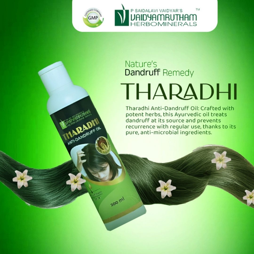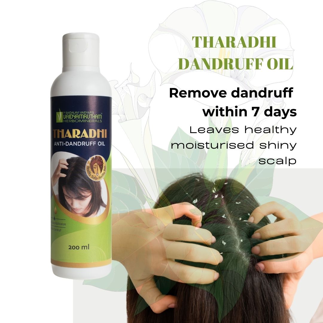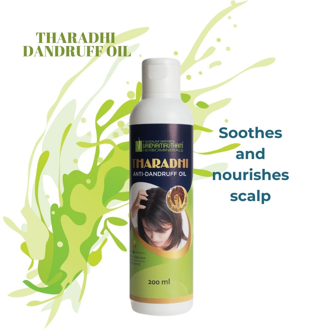 VaidyamruthamTharadhi Ayurvedic Anti-dandruff oil is meticulously crafted harnessing the power ofspecial potent herbs to treat dandruff at the source. This Ayurvedicoil contains pure ingredients which have anti-microbial properties to prevent the recurrence of dandruff with regular use.It can be used on all hair types of different age groups by preventing dandruff with regular use.We provide 100% Ayurvedic Natural hair oil that is chemical-free and free from parabens and sulphates. Regular use of this oil effectively removes dandruff. It leaves your scalp feeling healthy, moisturized, and shiny. The oil also soothes and nourishes your scalp, resulting in smooth and shiny hair.